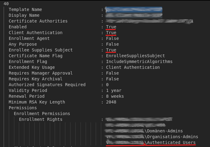 A template was found to be vulnerable to a domain privilege escalation attack. The configuration allowed domain users to enrol new certificates using this template with an arbitrary SAN (AKA ESC1 in the Certified Pre-Owned whitepaper from Specterops). These certificates can then be used for client authentication within the domain. This means a standard domain user can request a certificate specifying another user in the SAN, including administrators - and use that certificate to impersonate them on the domain.